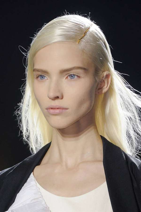 Για παράδειγμα, ο Οίκος Elie Saab επένδυσε στην τάση με τις στέκες και τοποθέτησε λεπτές χρυσές στέκες στην κορυφή ίσιων μαλλιών.