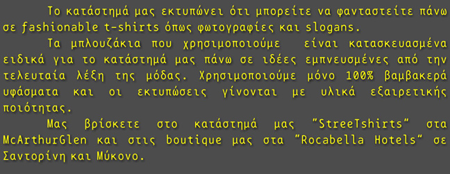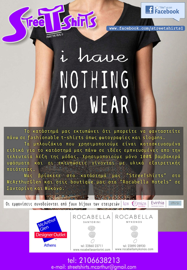 Το StreeTshirts εκτυπώνει ό,τι μπορείτε να φανταστείτε πάνω σε fashional t-shirts όπως φωτογραφίες και slogans. Το κατάστημα μπορείτε να το βρείτε στα McArthurGlen και στις boutique στα «Rocabella Hotels» σε Σαντορίνη και Μύκονο.
