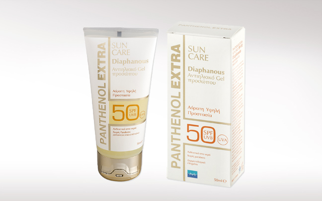 1. Το αντηλιακό gel προσώπου PANTHENOL EXTRA SUN CARE Diaphanous SPF 50. Η ειδική βελούδινη σύνθεσή του και τα επιλεγμένα UV αντηλιακά φίλτρα του, δημιουργούν ένα αόρατο φιλμ προστασίας από τις βλαβερές ακτίνες του ήλιου UVA & UVB. Η προσθήκη της panthenol και ενός εξειδικευμένου αμινοξέος με κλινικά αποδεδειγμένη δράση κατά των ρυτίδων, προσφέρει στην επιδερμίδα, την απαραίτητη ενυδάτωση αλλά και αντιρυτιδική προστασία ενώ η Βιταμίνη E προστατεύει το δέρμα από τις ελεύθερες ρίζες με αποτέλεσμα να αναστέλλεται η πρόωρη γήρανση της επιδερμίδας. H βελούδινη υφή και η ματ όψη του κάνουν το gel ιδανικό για βάση make-up. Ταυτόχρονα είναι ανθεκτικό στο νερό ενώ δεν περιέχει parabens.