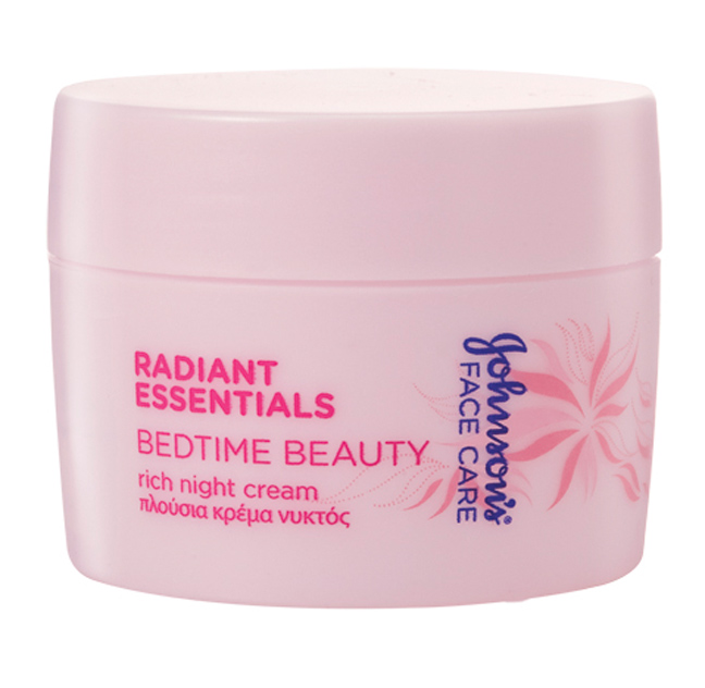 Johnson’s Radiant Essentials Πλούσια Κρέμα Νυκτός 50ml. Η πλούσια κρέμα νυκτός για πρόσωπο JOHNSON’S Radiant Essentials 50ml είναι εμπλουτισμένη με γάλα κάκτου και έλαιο αργκάν που συμβάλλουν στην αποκατάσταση της φρεσκάδας της επιδερμίδας, στην ανανέωση, την συνεχή ενυδάτωση και τη λάμψη της κατά τη διάρκεια της νύκτας για όμορφη φωτεινή επιδερμίδα που ακτινοβολεί. Π.Λ.Τ.: 7.30 ευρώ