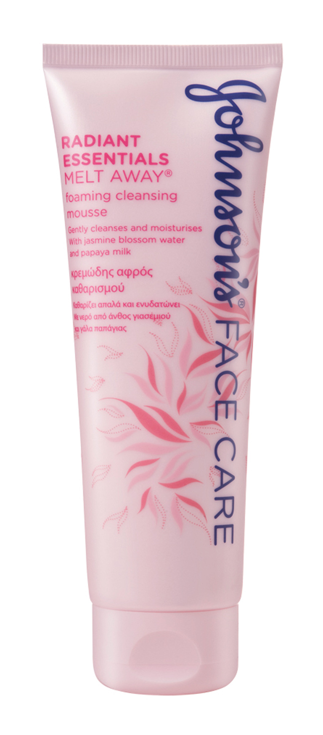 Johnson’s Radiant Essentials Κρεμώδης Αφρός Καθαρισμού 125ml. Ο αναζωογονητικός αφρός καθαρισμού JOHNSON’S Radiant Essentials απομακρύνει τους ρύπους (ακόμα και το αδιάβροχο μακιγιάζ), καθαρίζει απαλά αλλά αποτελεσματικά ενώ ταυτόχρονα ενυδατώνει, χάρη στο ανθόνερο γιασεμιού και στο γάλα παπάγιας και κάνει την επιδερμίδα αισθητά απαλότερη δίνοντάς της μια όψη φρεσκάδας και ζωντάνιας. Π.Λ.Τ: 5,35 ευρώ