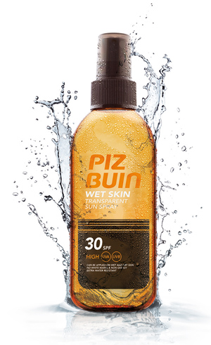 – PIZ BUIN WET SKIN TRANSPARENT SUN SPRAY: Διαφανές αντηλιακό spray για Mαύρισμα σε ΒΡΕΓΜΕΝΗ επιδερμίδα.