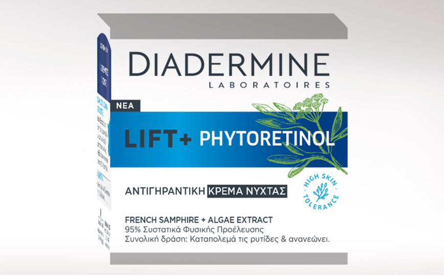 Η μοναδική σύνθεση της είναι εμπλουτισμένη με 95% συστατικά φυσικής προέλευσης και ενεργά συστατικά βοτάνων προερχόμενα από βιώσιμες πηγές, που προστατεύουν και σέβονται την επιδερμίδα σας. Ο συνδυασμός από έλαιο γαλλικού κρίταμου (French Samphire) και εκχύλισμα Algae συμβάλλει στην ανανέωση των κυττάρων και μειώνει τις ρυτίδες, βελτιώνοντας την όψη της επιδερμίδας τόσο αποτελεσματικά όσο το γνωστό συστατικό Ρετινόλη, δίχως να προκαλεί όμως τις παρενέργειες της στην επιδερμίδα. Επιπλέον, η νέα DIADERMINE LIFT+ Phytoretinol περιέχει Hyaluron και Bisabolol, δύο δερματολογικά ενεργά συστατικά για έντονη ενυδάτωση και καταπραϋντική δράση.