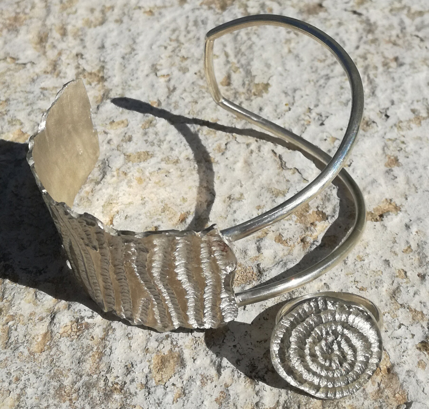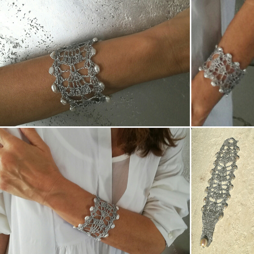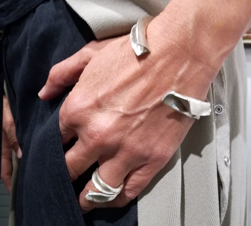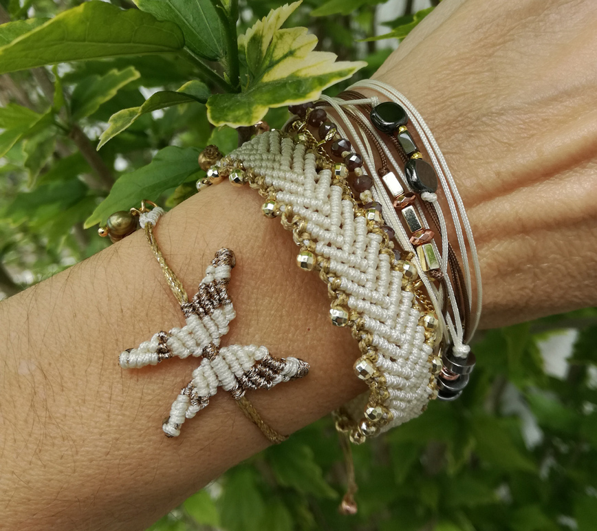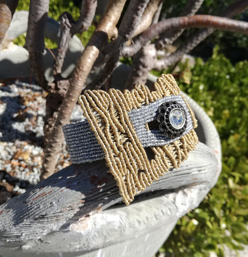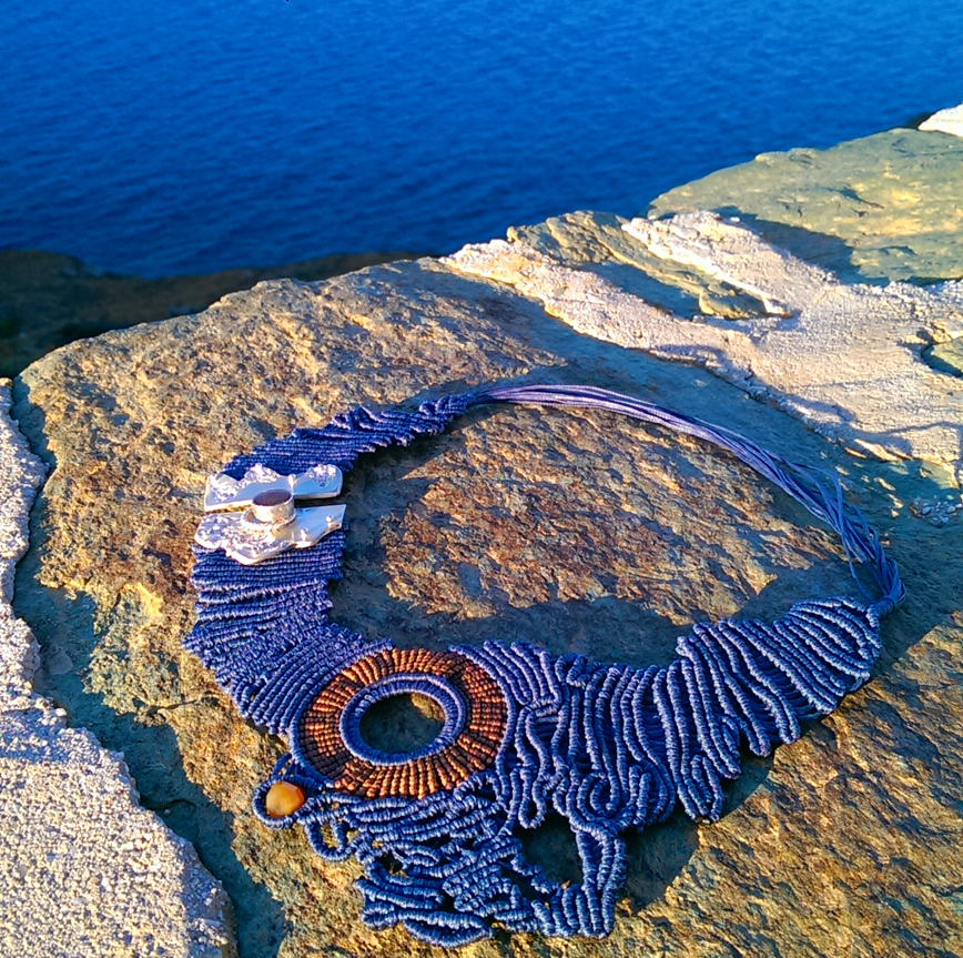 Παράλληλα, κάποια χρόνια πριν ήρθε στη ζωή της και η τέχνη του Μακραμέ, μια τέχνη ιδιαίτερα αγαπημένη για την ίδια και άκρως αγχολυτική. Έτσι ήρθαν να προστεθούν οι κόμποι και τα κορδόνια που μαζί με τα πολυμερή, τα κεραμικά και τις ημιπολύτιμους λίθους έρχονται να προσδώσουν μια κίνηση και μια ζεστασιά στα κοσμήματά της.