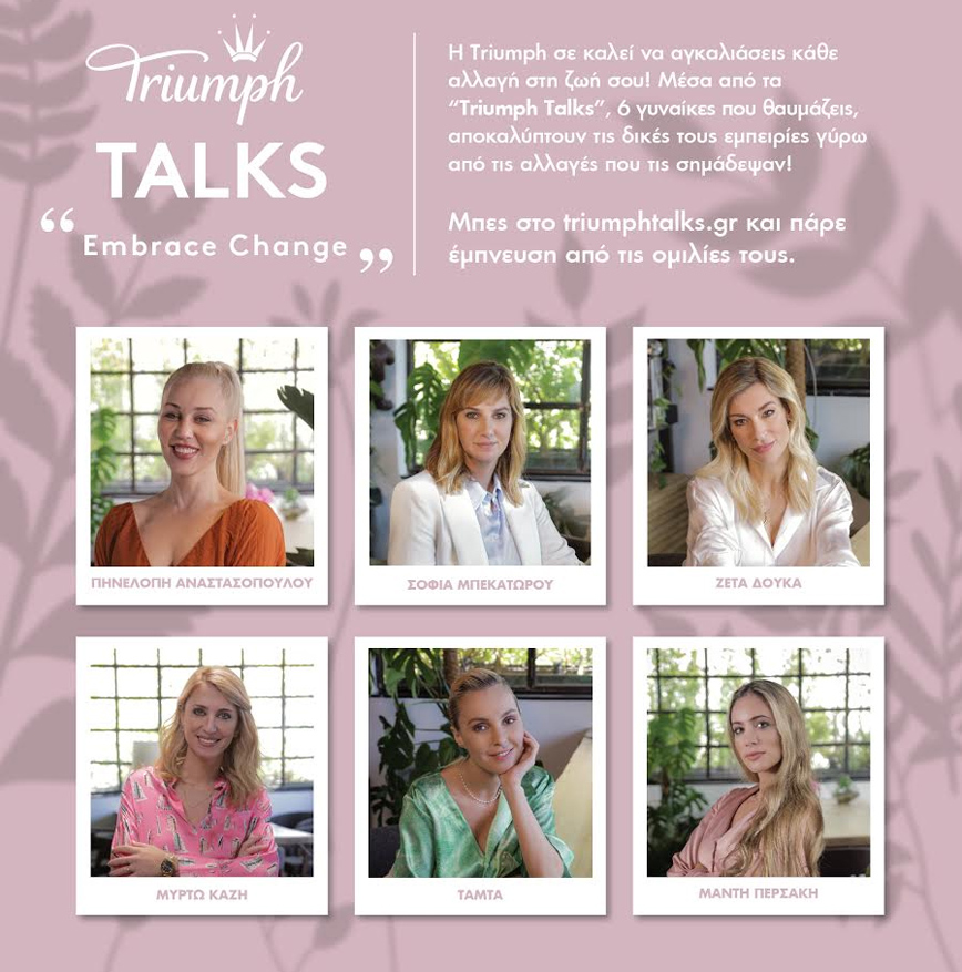Οι Πηνελόπη Αναστασοπούλου, Μάντη Περσάκη, Ζέτα Δούκα, Σοφία Μπεκατώρου, Μυρτώ Κάζη, και Τάμτα συμμετέχουν σε μια σειρά εμπνευστικών βίντεο-ομιλιών με τίτλο Triumph Talks – Embrace Change. Με αυτόν τον τρόπο η Τriumph θέλει να υπενθυμίσει σε όλες τις γυναίκες πως οποιαδήποτε αλλαγή που ενδεχομένως στην αρχή να φαντάζει δύσκολη ή ακόμα και τρομακτική, μπορεί να αντιμετωπιστεί!