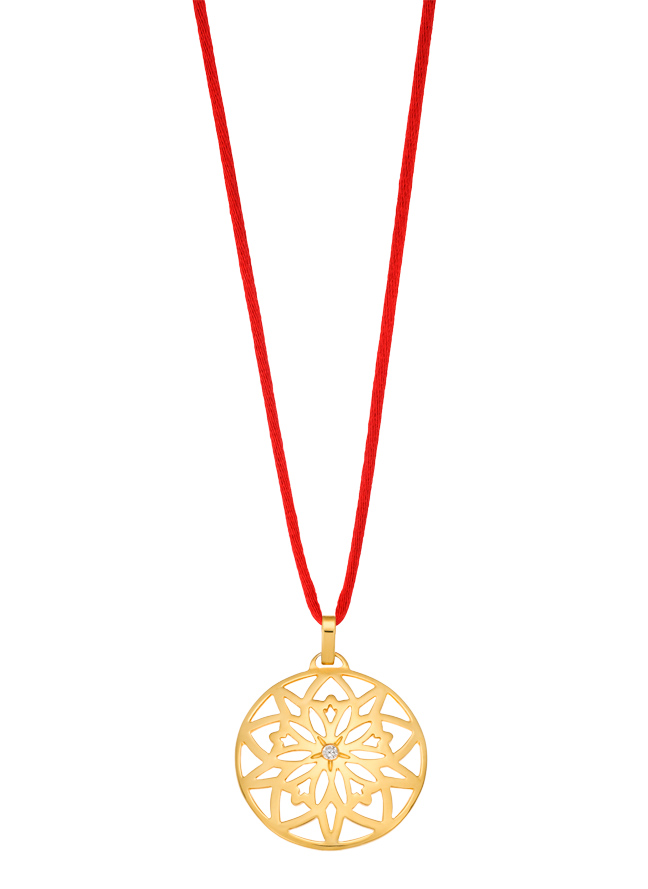Παντατίφ γούρι 2014 “Centaurea” μεγάλο, διάτρητο, σε κίτρινο χρυσό 18ΚΤ με διαμάντι με στριφτό σατέν κορδόνι που αυξομειώνεται, με κούμπωμα και τελείωμα σε κίτρινο χρυσό.