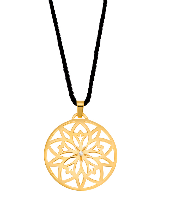 Παντατίφ γούρι 2015 “Centaurea” διάτρητο με διαμάντι, σε κίτρινο χρυσό 18ΚΤ με σατέν κορδόνι.