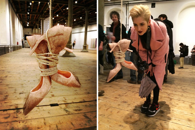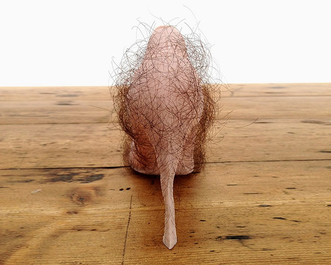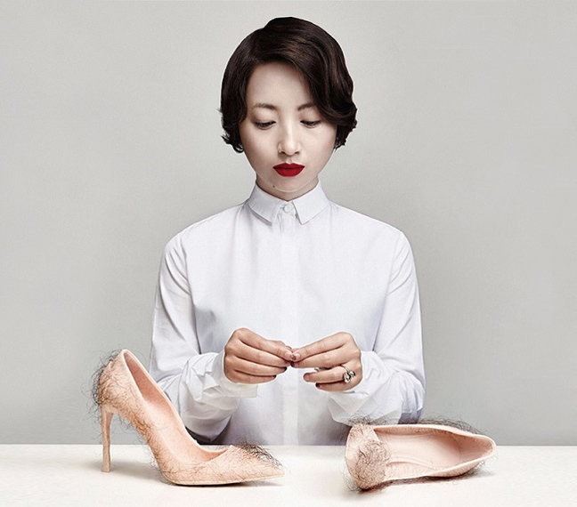Αυτό που επιδίωκε είναι να αναδείξει το πώς χρησιμοποιούμε τα τακούνια ως σεξουαλικά αντικείμενα, έτσι εμφύτευσε μαλλιά σε θήκες φτιαγμένες από gel.