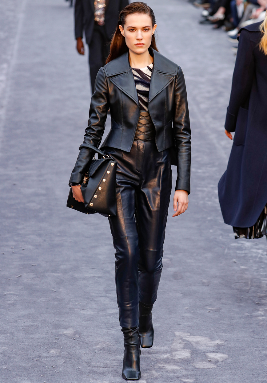 Οι κλασικές σκούρες αποχρώσεις -όπως το μαύρο, το καφέ ή το μπλε- χρησιμεύουν ως τέλεια βάση για να αναδείξετε πιο φωτεινές αποχρώσεις. Υπέροχη επιλογή ο απροσδόκητος συνδυασμός δερμάτινου παντελονιού στο χρώμα της σοκολάτας με φιστικί πράσινο και ζεστό ροζ σε τοπ και αξεσουάρ, αντίστοιχα, που βοηθά το βαρύ δερμάτινο ύφασμα να φαίνεται πολύ πιο κατάλληλο ακόμη και για την άνοιξη ή και το καλοκαίρι.
