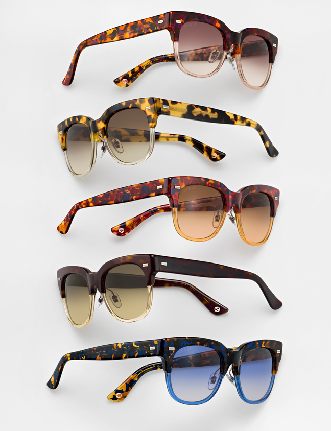Μια καινοτόμα χειροποίητη διαδικασία συγκόλλησης έχει χρησιμοποιηθεί στα δίχρωμα μοντέλα, δημιουργώντας αποκλειστικούς συνδυασμούς μεταξύ του τολμηρού καφέ πάνω μέρους και του λεπτού, διάφανου κάτω μέρους. Τα γυαλιά αυτά έχουν φακούς στους ίδιους τόνους ή ντεγκραντέ φακούς, ή καινοτόμους φακούς υπέρυθρων που προστατεύουν τα μάτια από τις επιπτώσεις της ζέστης, με κομψό αποτέλεσμα καθρέπτη στην πρόσοψη. Φίνες λεπτομέρειες κοσμούν τα μοντέλα αυτά, όπως τα λειτουργικά μεταλλικά στοιχεία, με το μίνιμαλ μεταλλικό μοτίβο Web να αναδεικνύεται μέσα από λαμπερά και ματ φινιρίσματα. Στους βραχίονες, η ειδική άρθρωση πέντε δακτυλίων εξασφαλίζει απόλυτη άνεση, ενώ τα ακροβραχιόνια διακοσμούνται από την φωτογραφικά χαραγμένη πλακέτα GG.