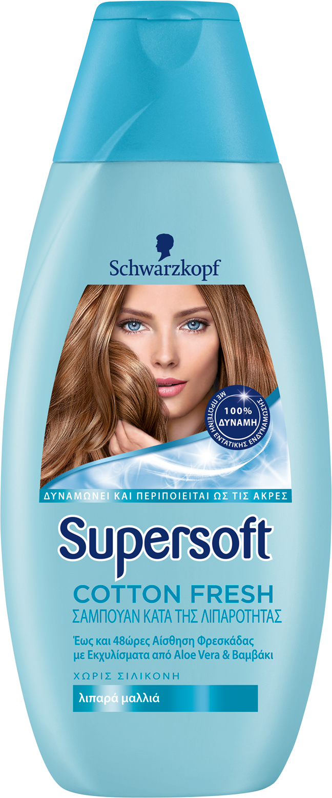 – Το Supersoft Cotton Fresh, με εκχυλίσματα Aloe Vera & Βαμβάκι, απομακρύνει αποτελεσματικά την λιπαρότητα από τα μαλλιά για φρεσκάδα έως και 48 ώρες.