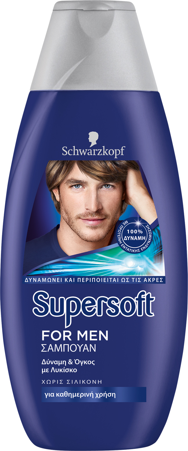– Το Supersoft For Men, με Λυκίσκο, ενδυναμώνει την τρίχα από την ρίζα και προσφέρει 100% δυνατά μαλλιά με φυσικό όγκο.
