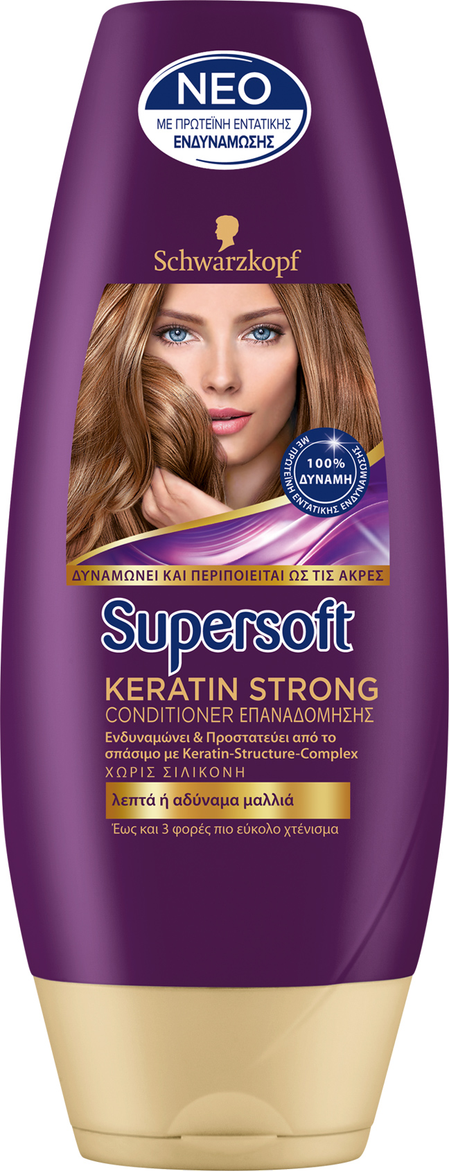 – Το Supersoft Keratin Strong, με Keratin-Structure-Complex, ενδυναμώνει και προστατεύει τα μαλλιά από το σπάσιμο.