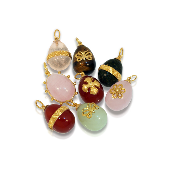 Χειροποίητες δημιουργίες σε χρυσά και ασημένια αυγά, ορειχάλκινα διακοσμητικά και πολύτιμους – ορυκτούς λίθους όπως αμέθυστος, rose quartz, crystal de roche, καρνεόλη, new jade, στολισμένα με την ιδιαίτερη τέχνη των έμπειρων χρυσοχόων, συνθέτουν έναν υπέροχο ανοιξιάτικο κόσμο.
