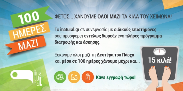 Ένα μοναδικό πρόγραμμα ανακοινώθηκε σήμερα: Το inatural σε συνεργασία με εξειδικευμένους επιστήμονες ετοίμασε το πρόγραμμα «100 Ημέρες Μαζί». Ένα ειδικά διαμορφωμένο πρόγραμμα που διατίθεται δωρεάν, ξεκινά 13 Απριλίου και ολοκληρώνεται στις 19 Ιουλίου. Στόχος του είναι να σας βοηθήσει να χάσετε σίγουρα και με ασφάλεια όλα τα παραπανίσια κιλά του χειμώνα, όπου και εάν βρίσκονται!