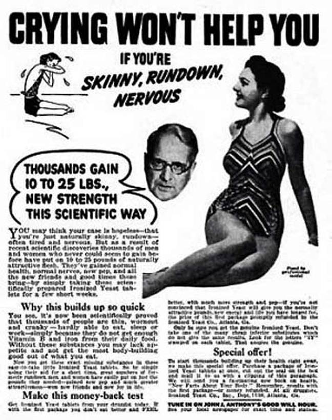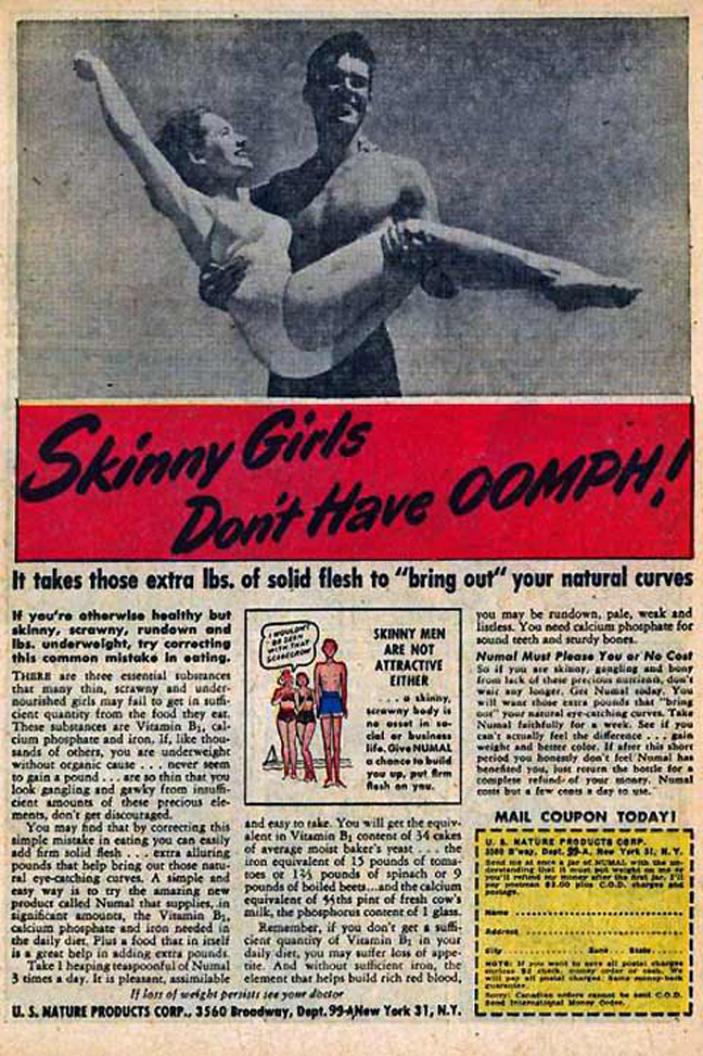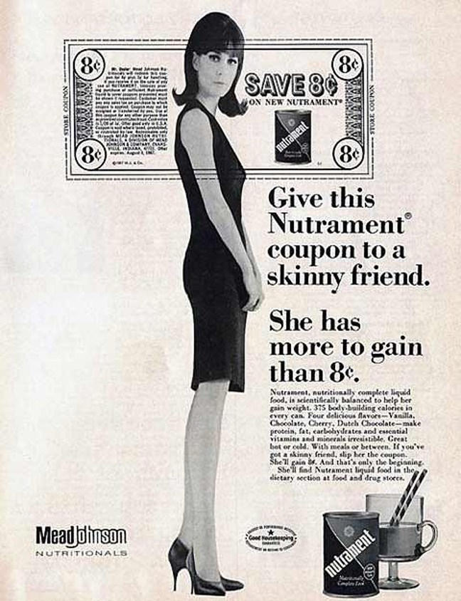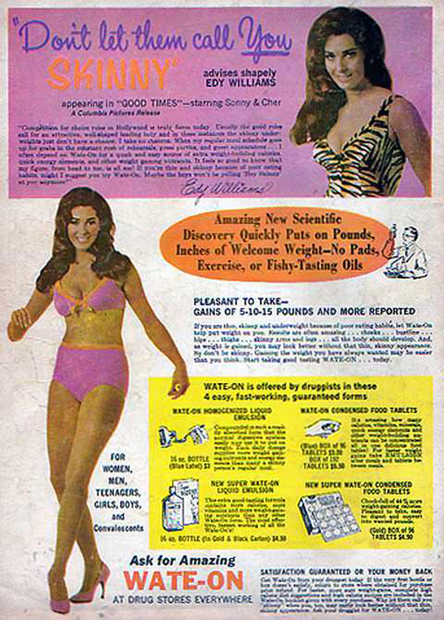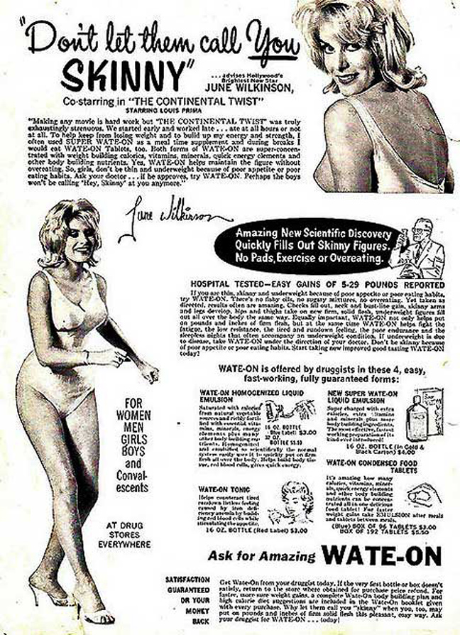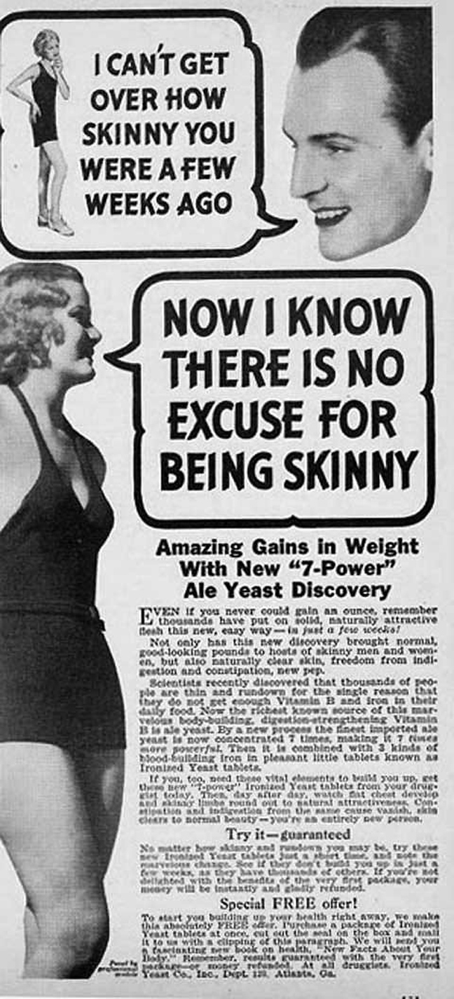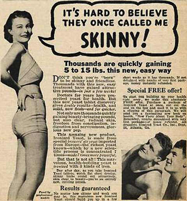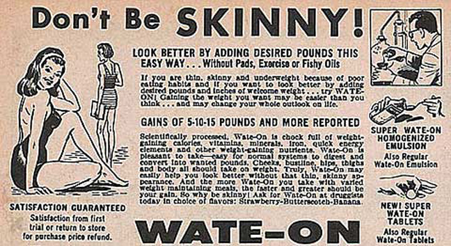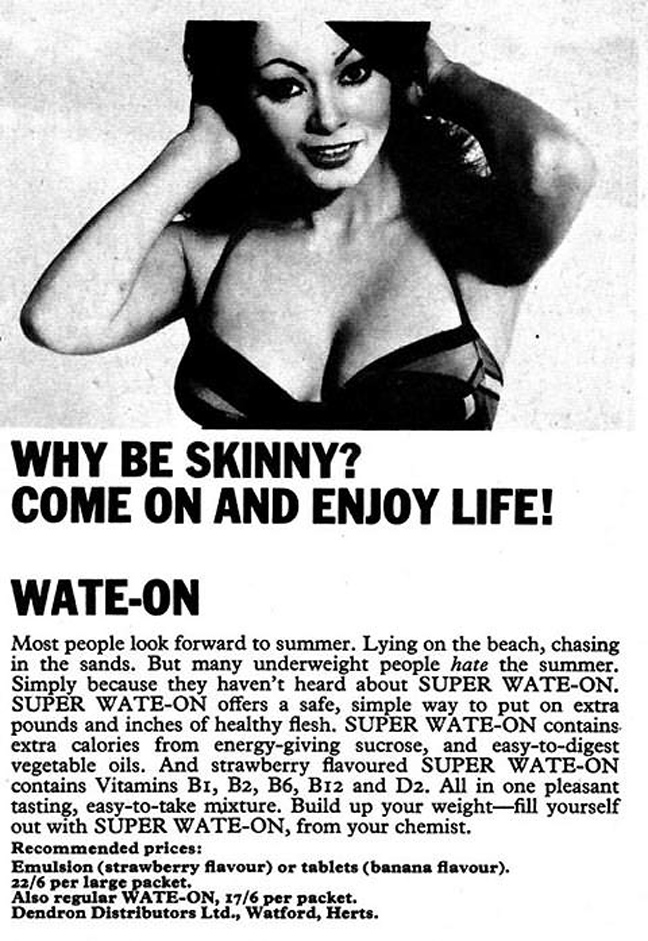 «Γιατί να είσαι αδύνατη (skinny); Ένα και απόλαυσε τη ζωή», προτρέπει μια διαφήμιση για ειδικό ενεργειακό σκεύασμα που υποσχόταν να σε παχύνει πριν βγεις στις παραλίες.