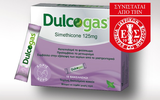 Το Dulcogas περιέχει αποκλειστικά και μόνο σιμεθικόνη, αποτελεί το μοναδικό προϊόν στην Ελλάδα με αυτή την ένδειξη. Έχει άριστο προφίλ ασφάλειας, δρα φυσικά, εξουδετερώνοντας τα αέρια που είναι εγκλωβισμένα μέσα στον γαστρεντερικό σωλήνα σε πολύ μικρό χρονικό διάστημα (λιγότερο από 15 λεπτά), ανακουφίζοντας άμεσα από τη δυσφορία που αυτά προκαλούν χαρίζοντας με αυτό τον τρόπο επίπεδη κοιλιά.