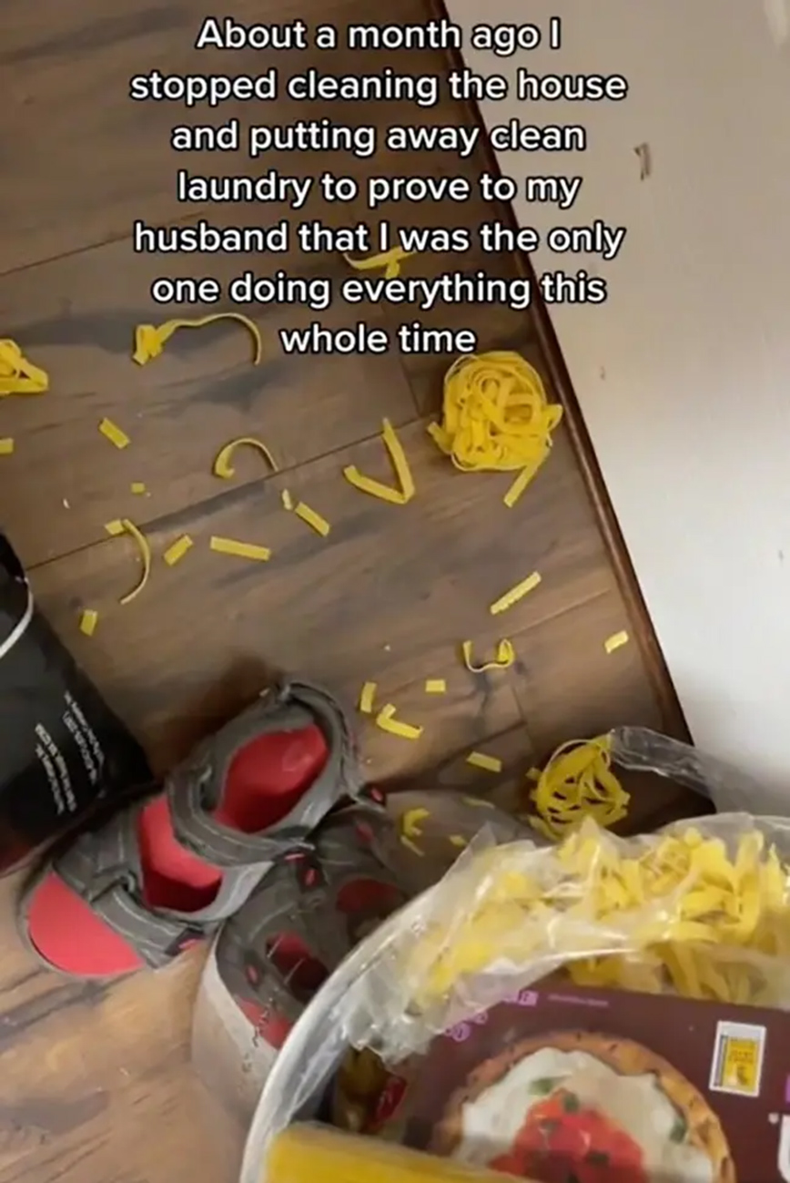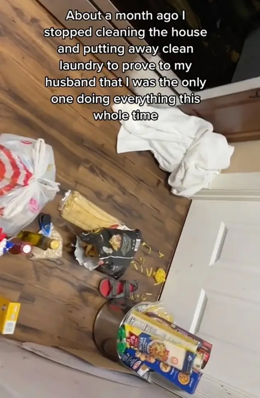 Η γυναίκα, η οποία αναρτά χρήσιμες πληροφορίες για το καθάρισμα με το όνομα @MrsMessyTikTok, στο συγκεκριμένο βίντεο περιέγραψε πώς «σταμάτησε να καθαρίζει το σπίτι» πριν από έναν μήνα. Ήθελε «να αποδείξει στον άντρα της ότι ήταν η μόνη που έκανε τα πάντα όλο αυτόν τον καιρό.