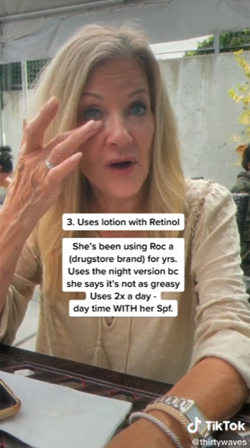Έπειτα, ως τρίτη και τελευταία συμβουλή, είναι η χρήση προϊόντων ρετινόλης. «Το βάζω στα μάτια μου, στο μέτωπό μου, τα μάγουλά μου, το λαιμό μου και το στήθος μου», είπε και πρόσθεσε «θα το κάνω δεύτερη φορά και, αν νομίζω ότι το χρειάζομαι, τρίτη φορά. Στο στόμα και στα μάτια μου».