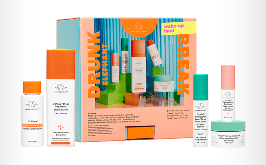 Χρειάζονται 30 ημέρες για να δείτε την επανεκκίνηση της επιδερμίδας σας όταν χρησιμοποιείτε αποκλειστικά το Drunk Break Morning ή Evening Edition – μαζί με οποιοδήποτε άλλο προϊόν Drunk Elephant.