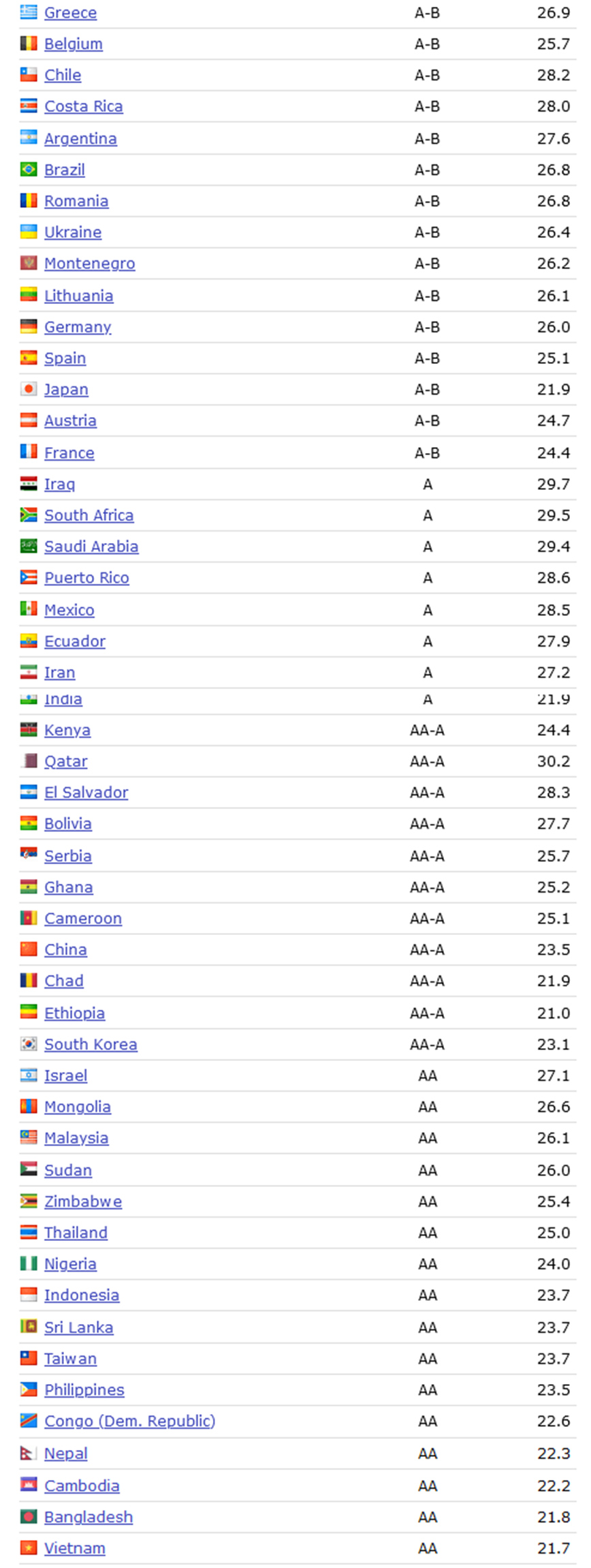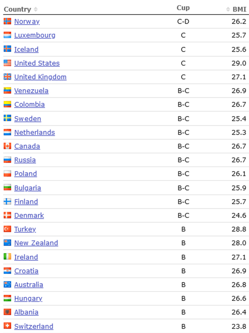 Στην κορυφή της λίστας πολλοί θα περίμεναν να δουν κάποια χώρα όπως η Βραζιλία ή κάποια μεσογειακή χώρα. Ωστόσο, την πρωτιά παίρνει η Νορβηγία με μέγεθος «C-D» σε μέσο δείκτη μάζας σώματος 26.2. Ακολουθεί, το Λουξεμβούργο, η Ισλανδία, οι ΗΠΑ και η Βρετανία που καταγράφουν μέγεθος C.