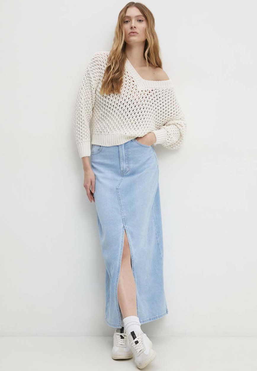 Πλεκτό + τζιν μακριά φούστα + αθλητικά