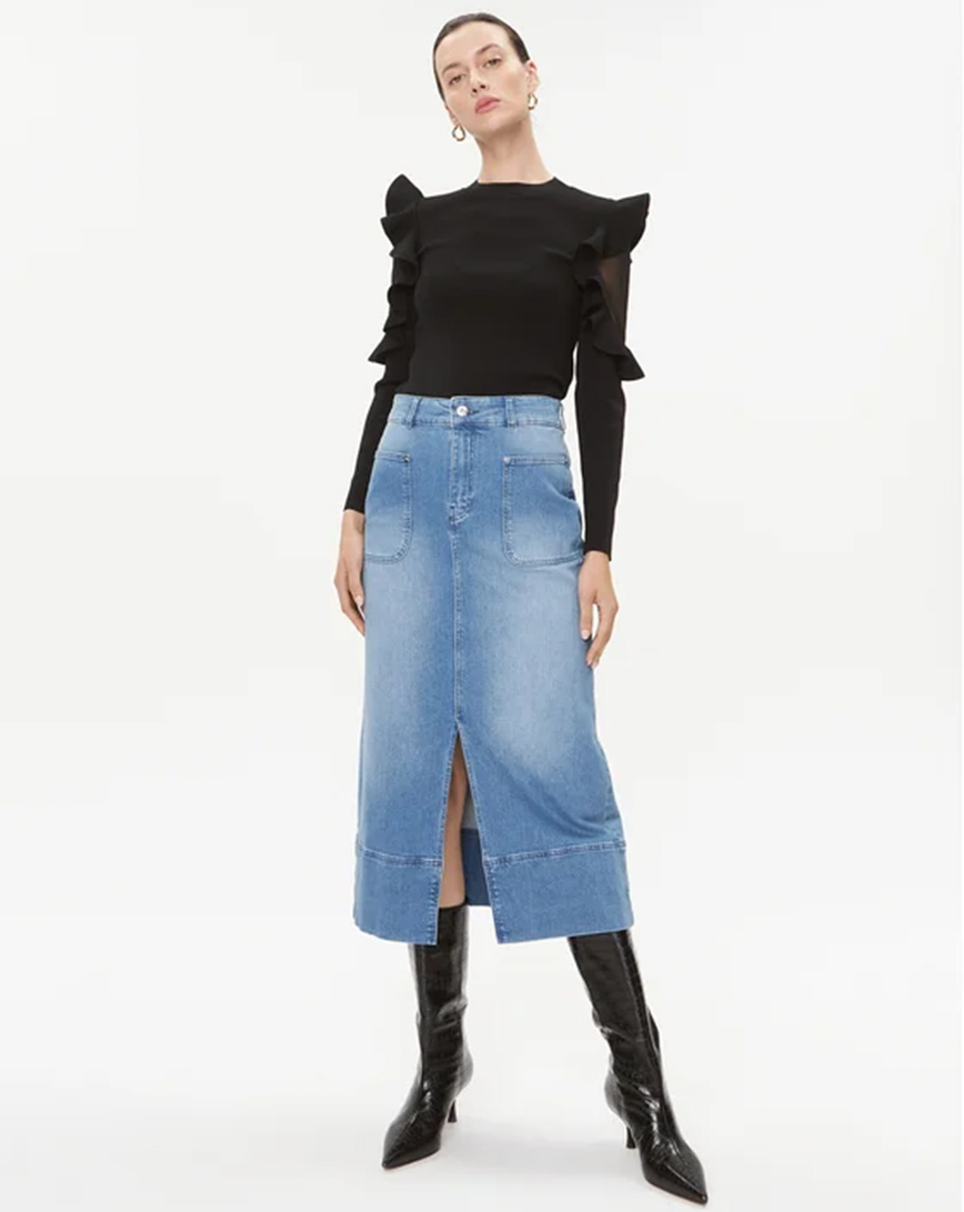 Μακρυμάνικο τοπ + τζιν μακριά φούστα με ξεβάμματα + kitten heels μπότες