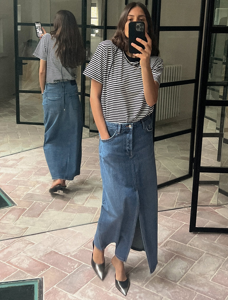 Κοντομάνικο τοπ + τζιν μακριά φούστα + kitten heels μπαλαρίνες