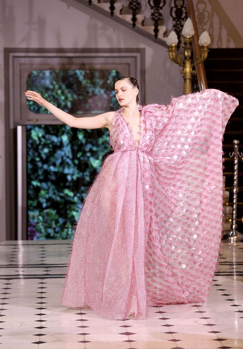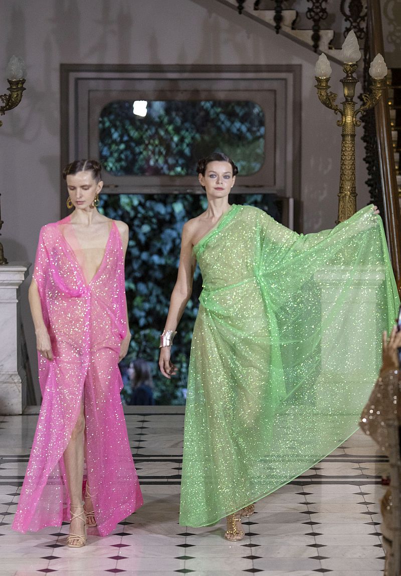 Ο ταλαντούχος σχεδιαστής δημιούργησε αποκλειστικά για την παρουσίαση πέντε νέα αριστουργήματα αρχαιοελληνικής γραμμής στα χρώματα της γαλλικής σημαίας, με τα μοντέλα να εισέρχονται στα σαλόνια της Γαλλικής Πρεσβείας από την εντυπωσιακή μαρμάρινη σκάλα στο κέντρο του κτηρίου.