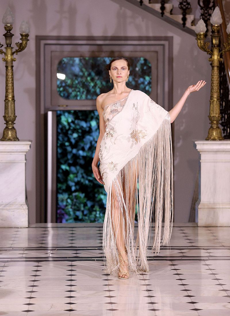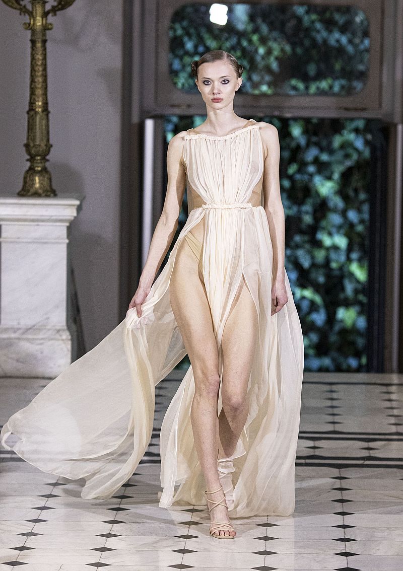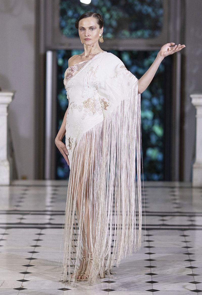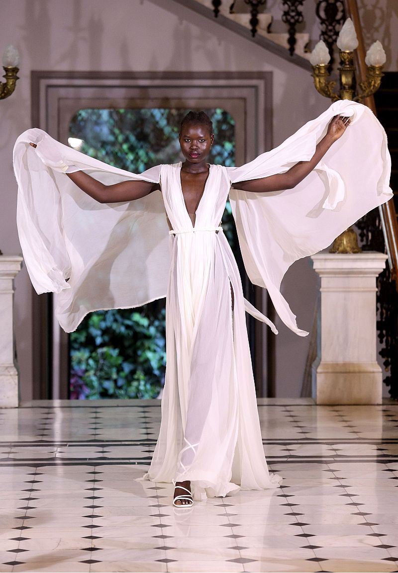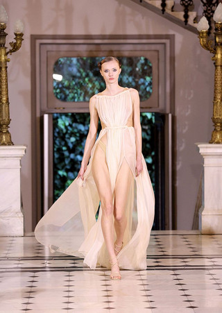 Αέρινα υφάσματα σε ανάλαφρες γραμμές, διαφάνειες, κρόσια και όγκοι είναι τα χαρακτηριστικά της συλλογής στην οποία κυριάρχησε το κυρίως το λευκό και η κλασική αρχαιοελληνική αισθητική.