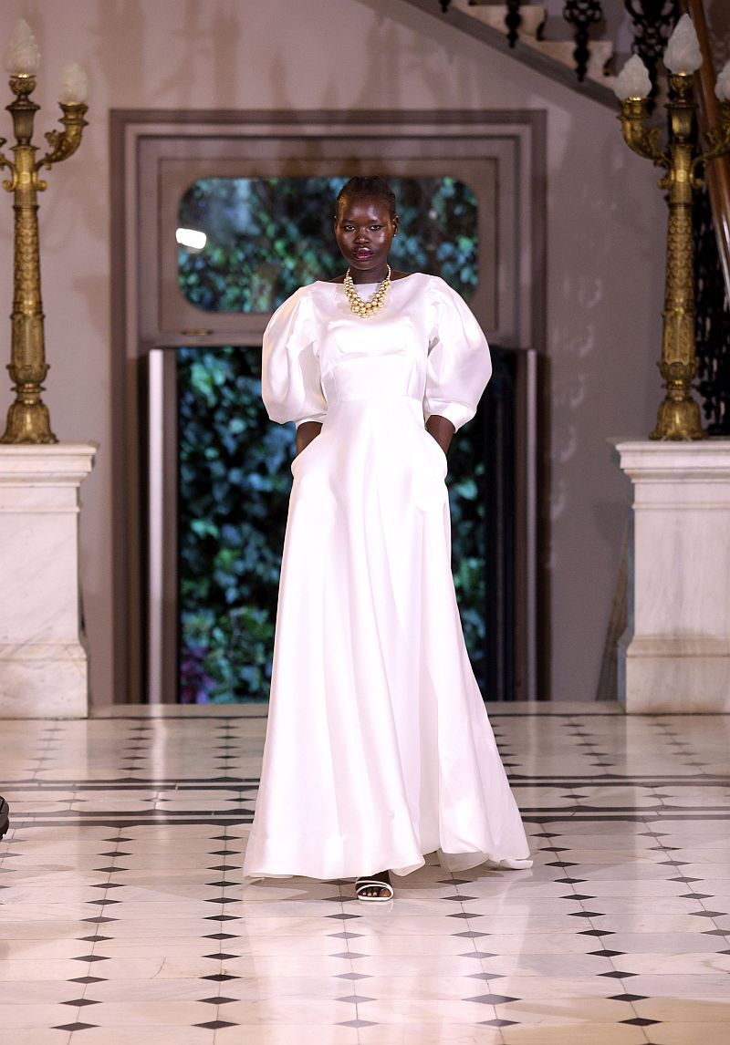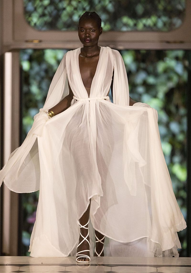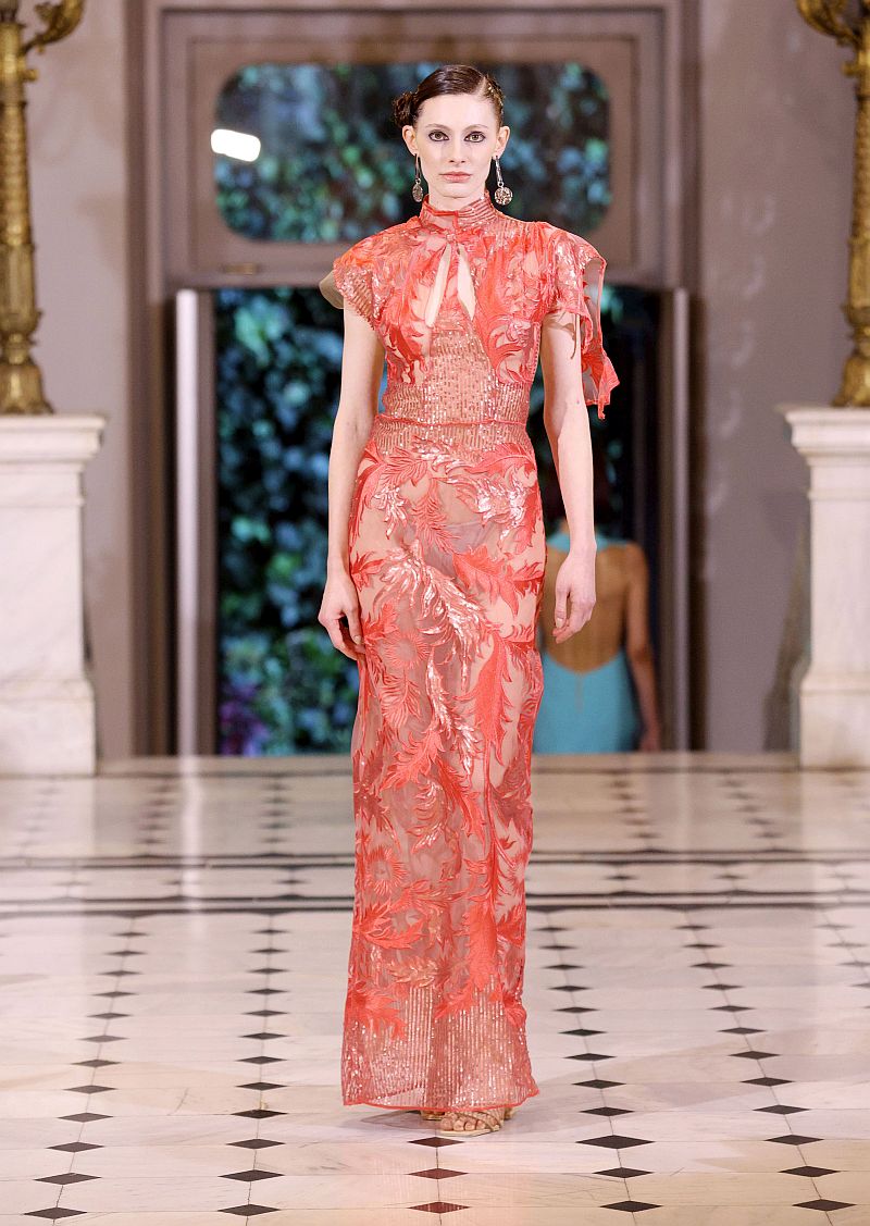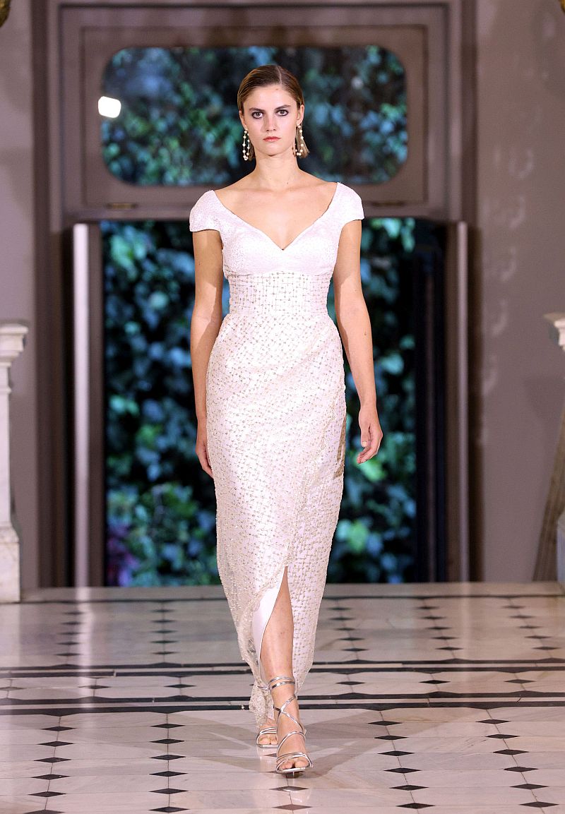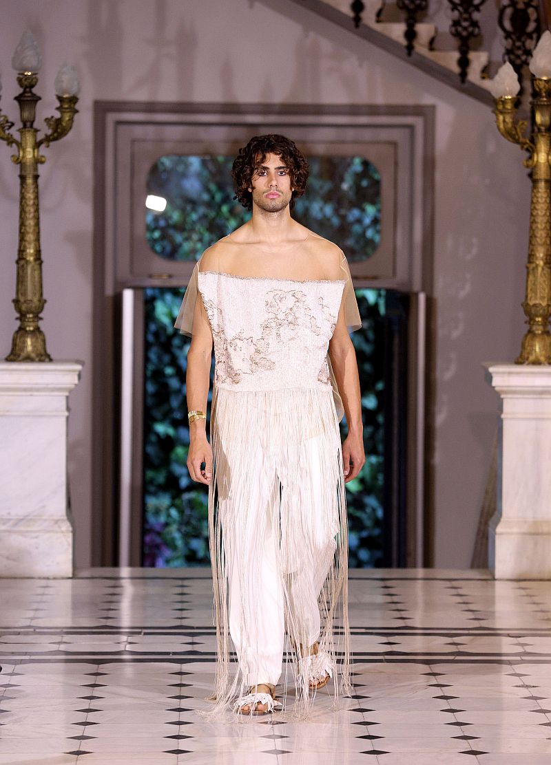 Αέρινα υφάσματα σε ανάλαφρες γραμμές, διαφάνειες, κρόσια και όγκοι είναι τα χαρακτηριστικά της συλλογής στην οποία κυριάρχησε το κυρίως το λευκό και η κλασική αρχαιοελληνική αισθητική.