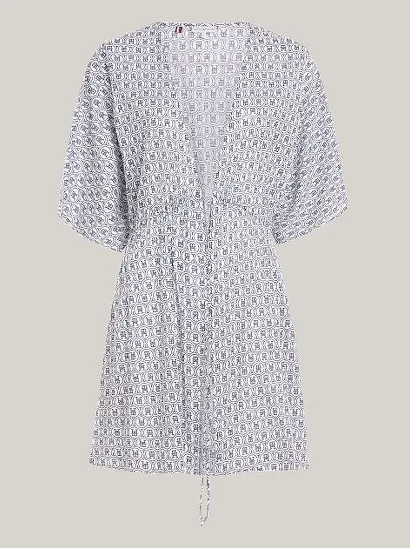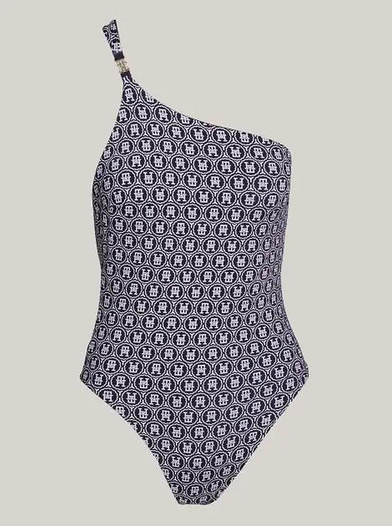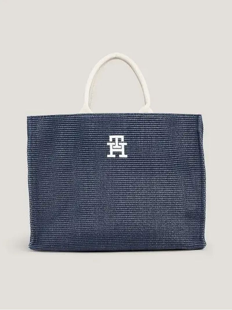 Το look παραλίας της παρουσιάστριας του «Shopping Star» αποτελείται από ένα ολόσωμο μαγιό με έναν ώμο, ένα άνετο ριχτό φόρεμα και όχι μία, αλλά δύο πλεκτές tote τσάντες σε ναυτικό μπλε χρώμα – όλα Tommy Hilfiger. Το μαγιό και το φόρεμά της, μάλιστα, έφεραν ως μοτίβο το λογότυπο του brand.