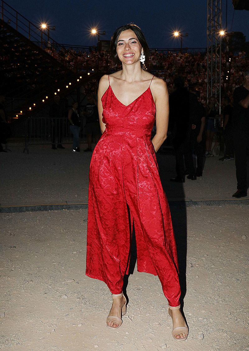 Η Νεφέλη Φασούλη συνδύασε την ολόσωμη φόρμα με πέδιλα σε nude απόχρωση και μακριά bohemian σκουλαρίκια, ενώ το μακιγιάζ της ήταν σε επίσης nude τόνους, κρατώντας έτσι ισορροπία στο look.