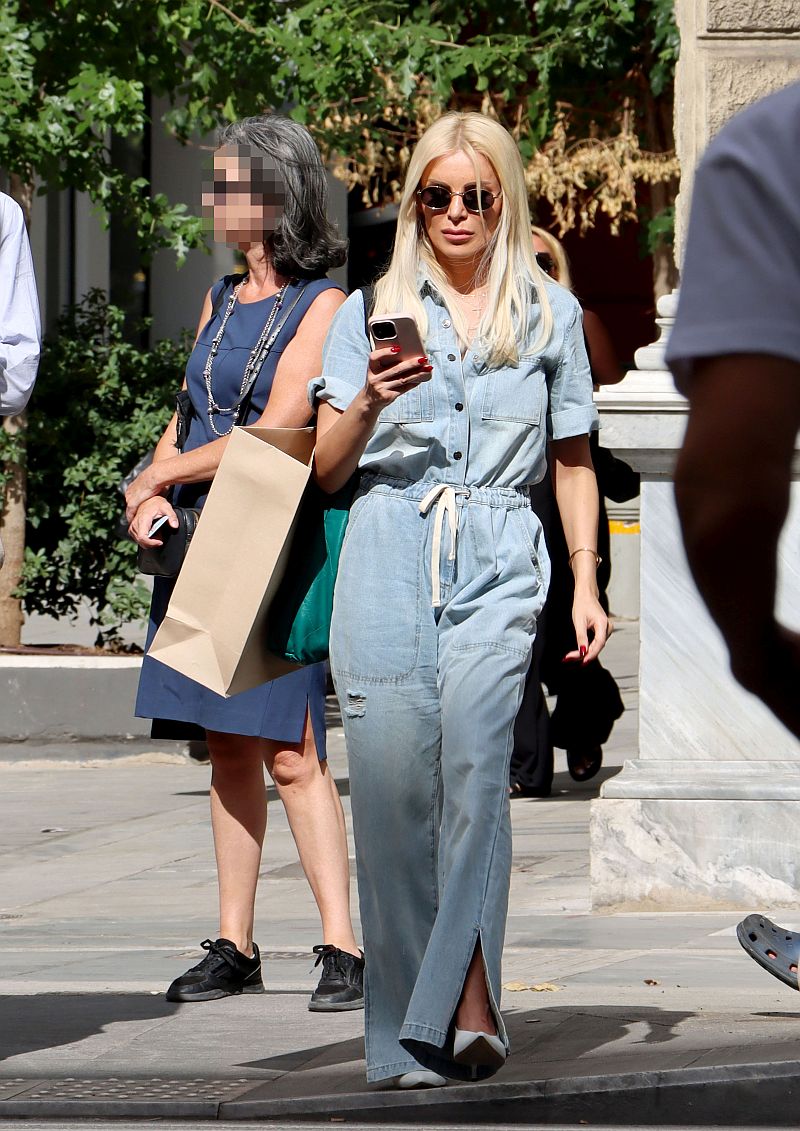 O φωτογραφικός φακός απαθανάτισε την Κατερίνα Καινούργιου σε μία βόλτα της για ψώνια στο κέντρο της Αθήνας με μια ολόσωμη ντένιμ φόρμα σε χαλαρή γραμμή με κοντά μανίκια και άνοιγμα στα τελειώματα του παντελονιού που άφηνε να φαίνονται οι λευκές γόβες της.