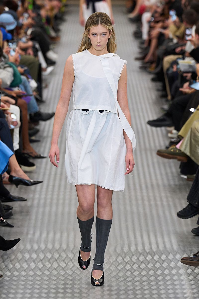 H επιλογή της 16χρονης Sunday Rose εναρμονίζεται απόλυτα με το θέμα της επίδειξης λόγω του νεαρού της ηλικίας της. Η συνέχεια της περιγραφής μιλάει ίσως για το ρούχο που φορούσε το νεαρό μοντέλο: «Ένα λευκό βαμβακερό φόρεμα είναι αφετηρία. Τα κομμάτια που προέρχονται απευθείας από τις ντουλάπες της «βρεφικής ηλικίας» είναι πρωτότυπα αντικείμενα, καθαρά σε μορφή και ρόλο. Μια συνεργασία μεταξύ της Miu Miu και του Petit Bateau επαναπροσδιορίζει τα κλασικά τους κομμάτια για διαφορετικές ηλικίες».