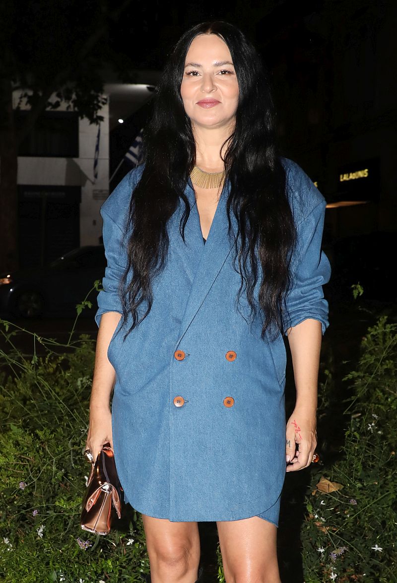 Η παρουσιάστρια του «First Dates» επέλεξε ένα oversized ντένιμ σακάκι σε γαλάζια απόχρωση και το συνδύασε με μαύρες μπότες μέχρι το γόνατο, ολοκληρώνοντας το look της με μια μικρή handbag.