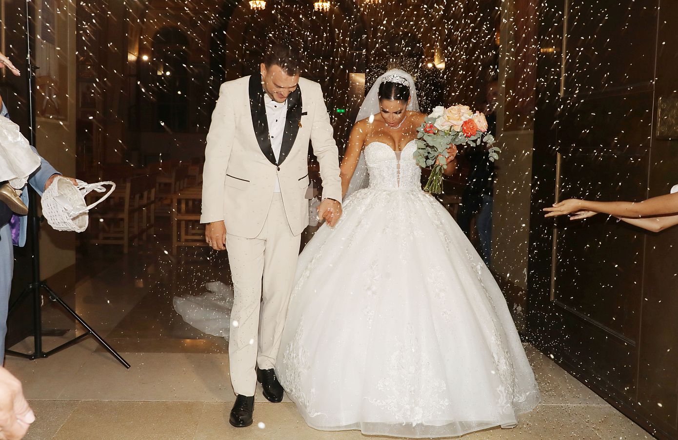 Το πάνω μέρος του νυφικού ήταν στενό και αναδείκνυε το πλούσιο μπούστο της, ενώ το κάτω μέρος είχε πολύ όγκο, με την balloon φούστα να καλύπτεται από τούλι που είχε κεντημένα διακριτικά σχέδια.