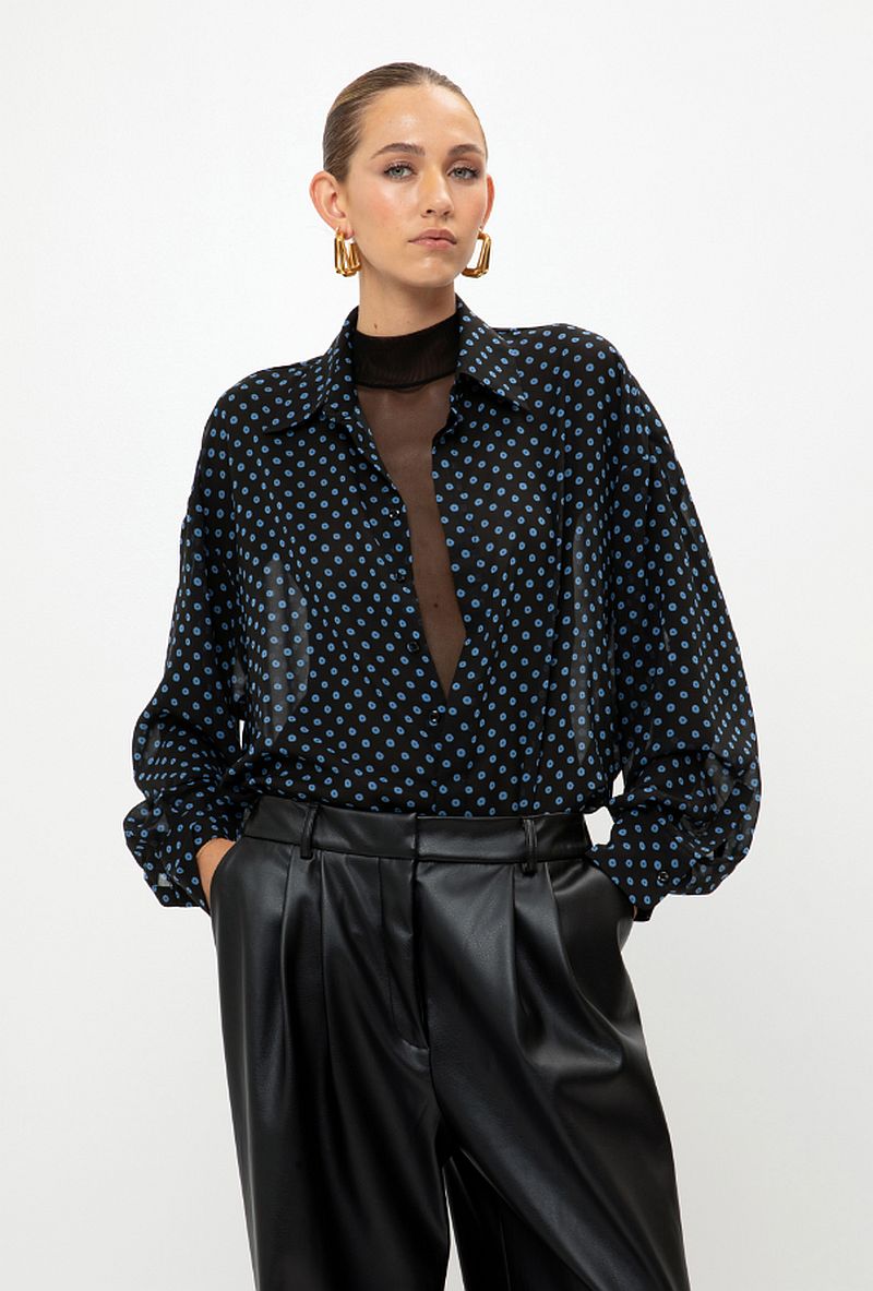 Το μοτίβο polka dot είναι ένα από τα πιο κομψά pattern που έχει συνδεθεί με τη διαχρονική κομψότητα ενώ η ψηλόμεση φαρδιά παντελόνα κολακεύει τη γυναικεία σιλουέτα προσθέτοντας μήκος στα πόδια.