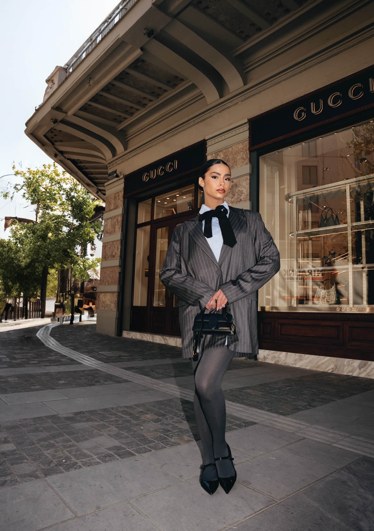 Πρόκειται για ένα παντελόνι και ένα blazer το οποίο λανσάρει από το brand της Bubblegun και μάλιστα έχει γίνει ανάρπαστο όπως είπε η ίδια σε σχετικό story που ανέβασε στον προσωπικό της λογαριασμό στο Instagram, ενημερώνοντας επίσης τους ακολούθους της ότι φοράει νούμερο Medium. Ολοκλήρωσε την εμφάνισή της με λευκή chain bag, μαύρες pointed γόβες και διακριτικά κοσμήματα.
