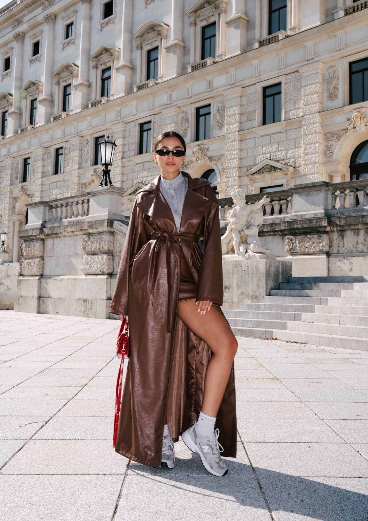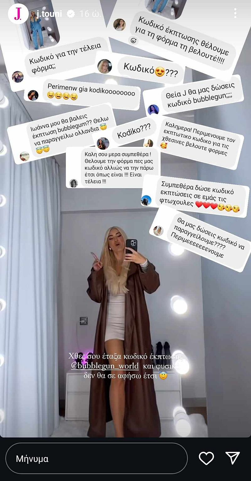 Σε ένα από τα stories που ανέβασε την προηγούμενη ημέρα από το event, χαρακτήρισε την καμπαρντίνα της «κιμπάρικη», θέλοντας να τονίσει το γεγονός ότι είναι oversized, ενώ επίσης μάθαμε πως από μέσα φορούσε μίνα μίνι ελαστική φούστα και ασορτί τοπ (επίσης από το brand της) σε μπεζ χρώμα, ενώ μέσα από ένα άλλο story πληροφορηθήκαμε πως αυτό ήταν το πρώτο fashion show που παρακολούθησε ο γιος της και μάλιστα του άρεσε.