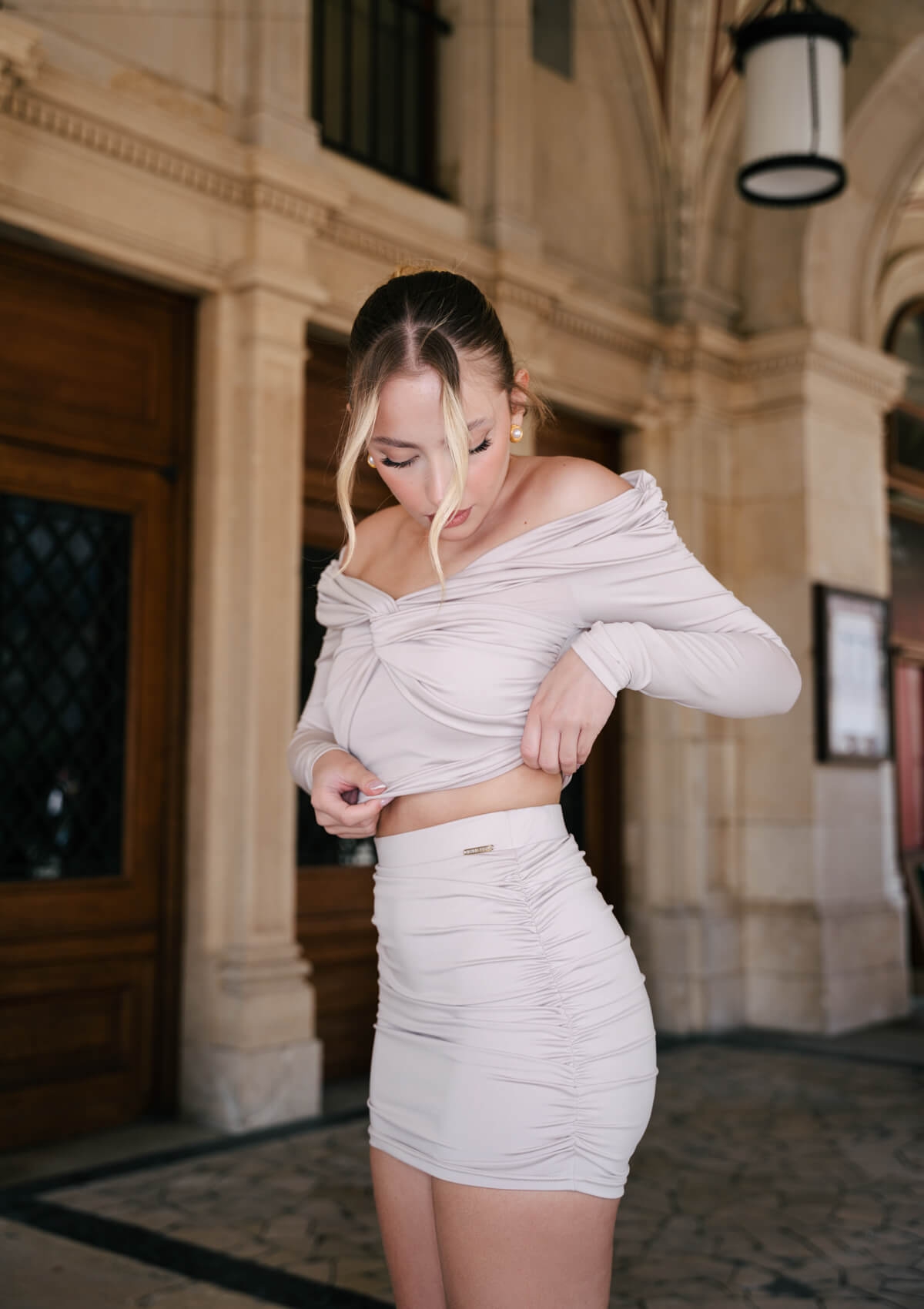 Όσο για το τοπ και τη φούστα, πρόκειται για το Still Waiting Top και τη Still Waiting Skirt που κοστίζουν €36.90 και €29.90 αντίστοιχα.