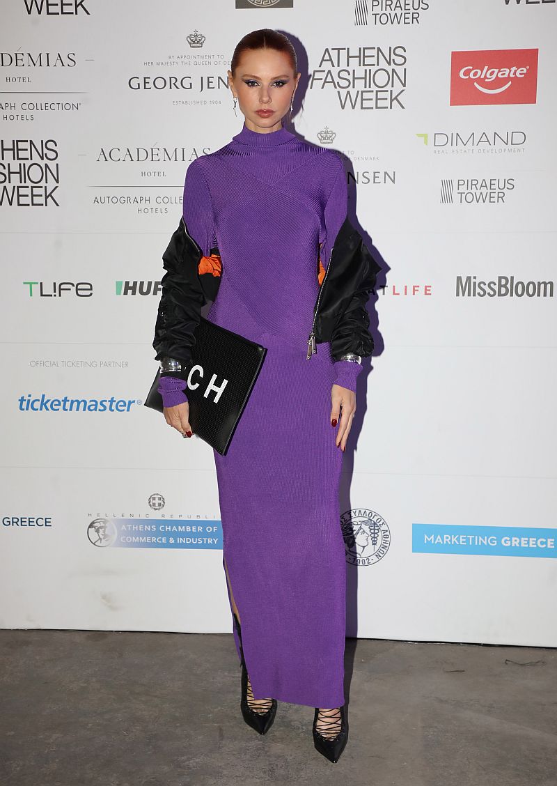 Για την εμφάνισή της η Έβελυν Καζαντζόγλου επέλεξε ένα μακρύ στενό φόρεμα σε μωβ χρώμα, μαύρο μπουφάν, pointy γόβες με κορδόνια και κρατούσε μία τσάντα φάκελο με την υπογραφή του σχεδιαστή.