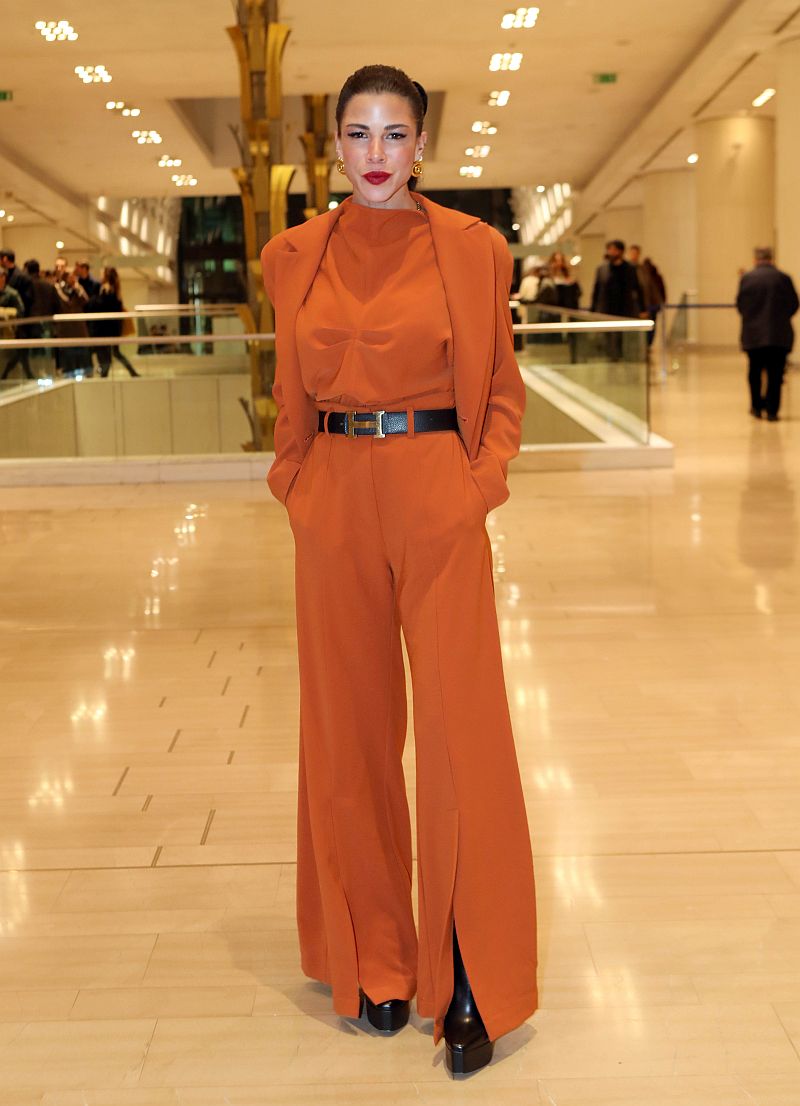 Σύνολο που αποτελείται από παντελόνι, τοπ και σακάκι σε βαθύ πορτοκαλί χρώμα από τη Δάφνη Καραβοκύρη.