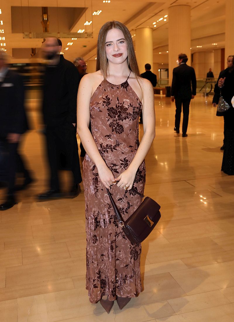 Μακρύ φόρεμα με φλοράλ μοτίβο στο χρώμα της μόκας και τσάντα σε σκούρο καφέ για την Αναστασία Τσιλιμπίου.