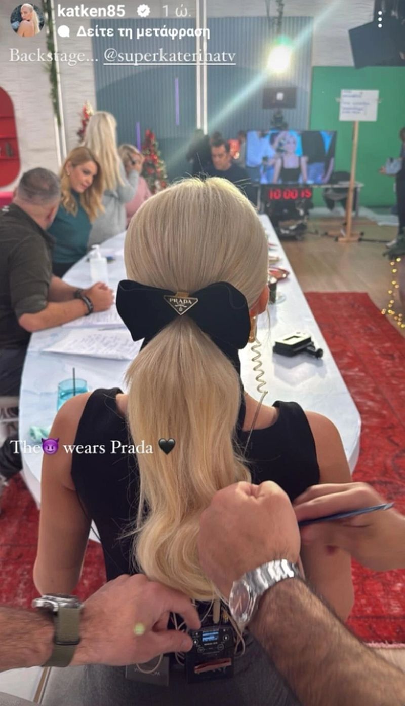 Η Κατερίνα Καινούργιου συνόδευσε την φωτογραφία από τα backstage γράφοντας για το φιόγκο της τον τίτλο της ταινίας στην οποία πρωταγωνιστούσαν η Meryl Streep και η Anne Hathaway «The Devil Wears Prada.»