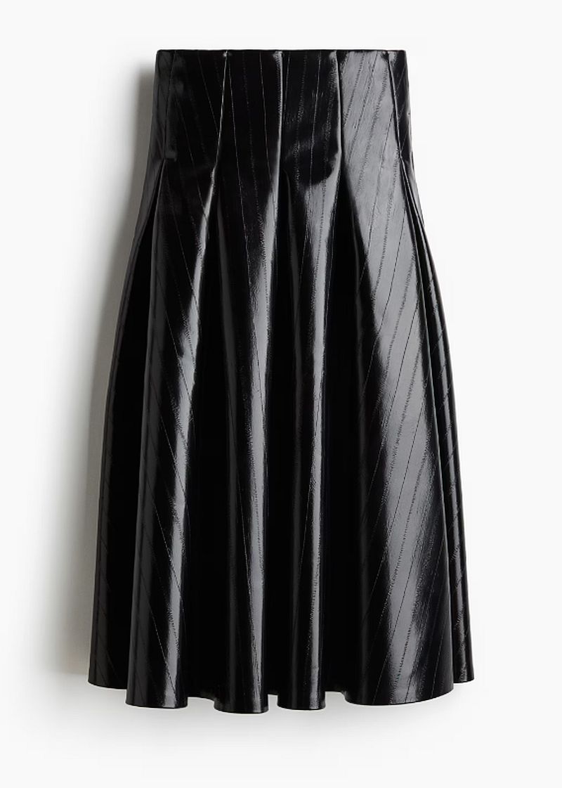 Πρόκειται για ένα κομμάτι από την τρέχουσα συλλογή του brand H&M, το οποίο είναι διαθέσιμο αποκλειστικά online και όχι στα φυσικά καταστήματα. Είναι μία μαύρη εβαζέ φούστα από ύφασμα με ειδική επεξεργασία με ψηλή μέση σε άλφα γραμμή και κοστίζει 79,99 ευρώ.