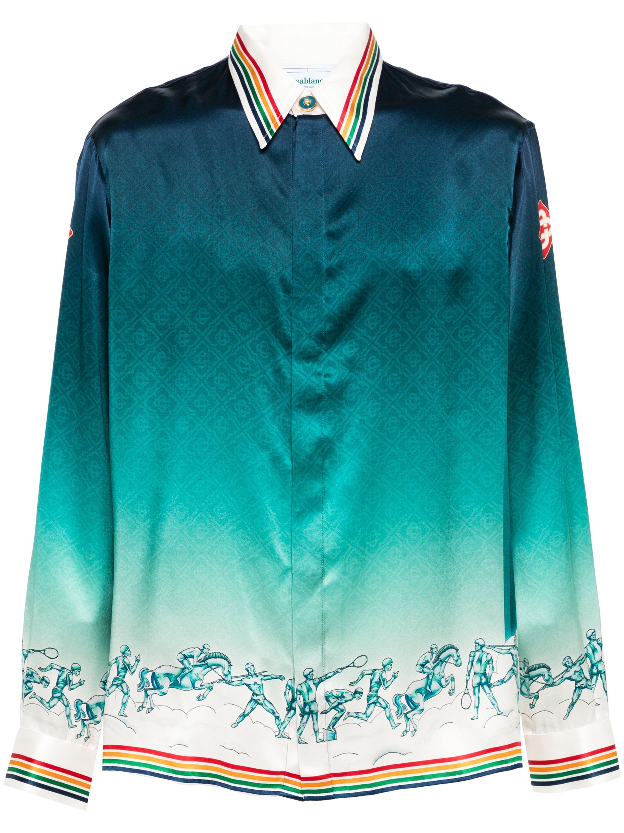 Ο Πάνος Βλάχος φόρεσε ένα μεταξωτό πουκάμισο με μοτίβο από το brand Casablanca Paris και συγκεκριμένα το σχέδιο La Déesse Du Stade Silk Shirt το οποίο κοστίζει στο Farfetch 865 ευρώ.