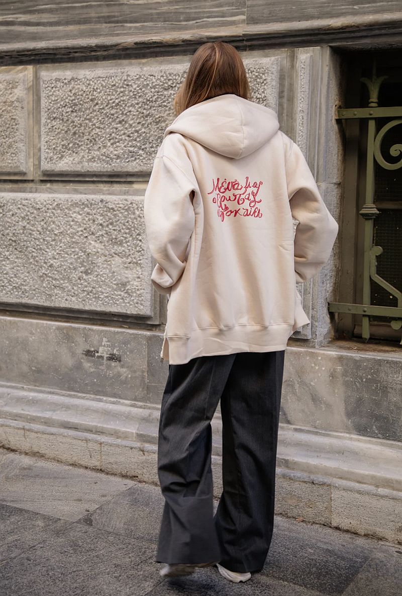 Πρόκειται για μία ζακέτα φούτερ με κουκούλα στο χρώμα της κρέμας, oversized και one size που κυκλοφορεί σε λίγα κομμάτια και, όπως το βλέπουμε, μάλλον θα χωρέσει μέσα του και τον δικό σας έρωτα που σιγοκαίει χαρίζοντάς του μια μεγάλη, ζεστή αγκαλιά. Αν λοιπόν ψάχνετε κάτι συμβολικό, αλλά ταυτόχρονα κομψό και άνετο, νομίζουμε πως το συγκεκριμένο hoodie είναι μια πολύ καλή λύση.