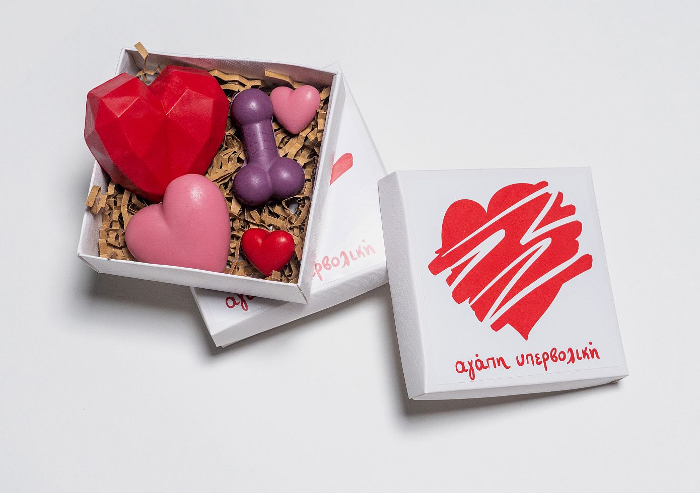 Το Love Gift Box περιλαμβάνει το limited edition T-shirt «Αγάπη Υπερβολική», σαπούνια-καρδιές σε διάφορα μεγέθη, χρώματα και σχήματα, καθώς και ένα παιχνιδιάρικο σαπούνι-έκπληξη, που σχεδιάστηκαν για να τονίσουν πως ο έρωτας δεν είναι μόνο ένα πράγμα.