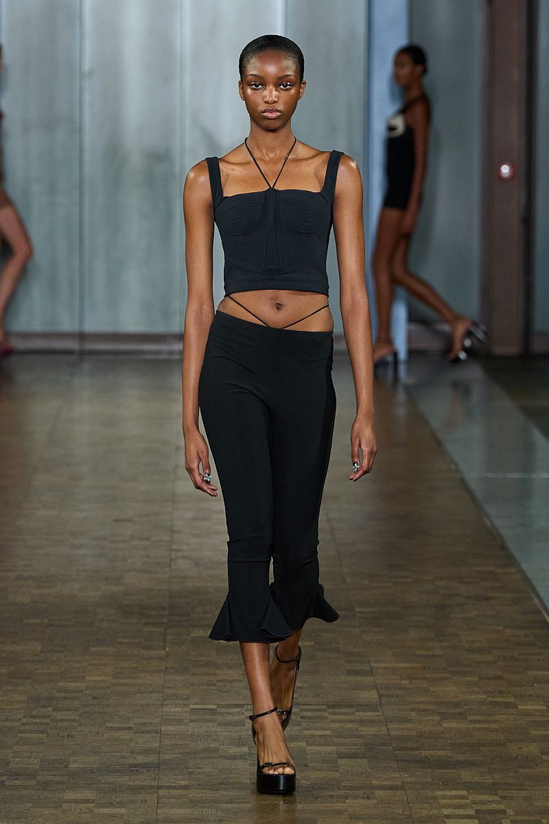 Αυτός ο συνδυασμός έρχεται κατευθείαν από τα ’90s, καθώς έτσι φόρεσαν τότε τα συγκεκριμένα παντελόνια όλες, από τις Spice Girls μέχρι εμάς. Η Nensi Dojaka έδειξε capri με βολάν συνδυασμένα με bra top και παπούτσια sandal plattforms.